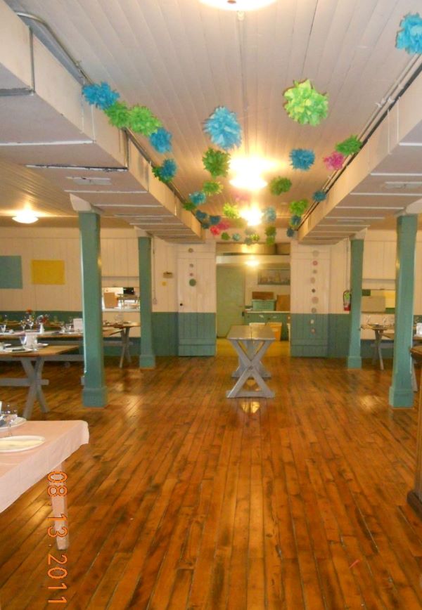 The main section measures 64 feet x 40 feet and houses the two-story hall on the first floor and a meeting space/dining room plus a kitchen in the basement. The upstairs space was originally called a ‘dance floor’. There is stage at the north end of the hall and a tuned piano and wireless sound system are available. With sets of windows 11 feet wide and 22 feet high on three sides of the hall, daylight streams in and the park outside becomes part of the interior. An elevator provides handicap access to the basement and first floor.