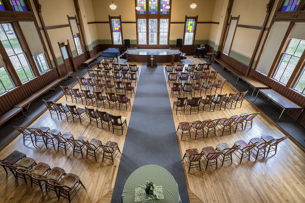 The main section measures 64 feet x 40 feet and houses the two-story hall on the first floor and a meeting space/dining room plus a kitchen in the basement. The upstairs space was originally called a ‘dance floor’. There is stage at the north end of the hall and a tuned piano and wireless sound system are available. With sets of windows 11 feet wide and 22 feet high on three sides of the hall, daylight streams in and the park outside becomes part of the interior. An elevator provides handicap access to the basement and first floor.
